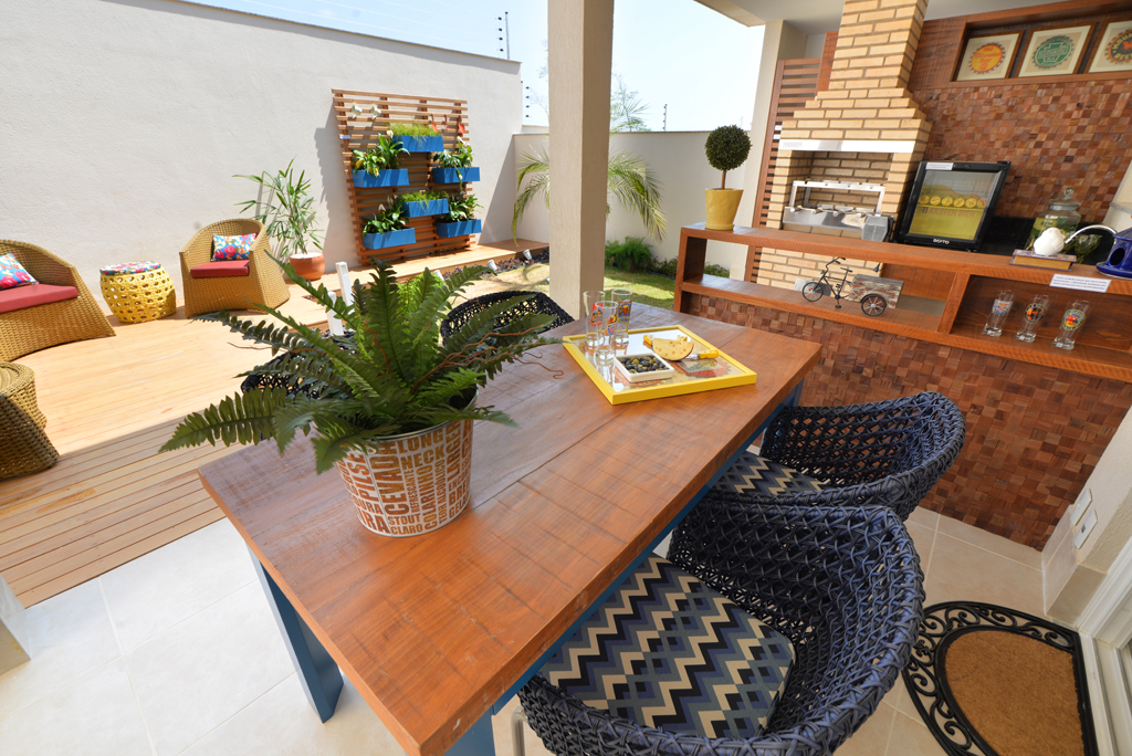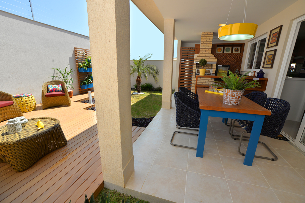 Para um aproveitamento total do espaço externo, o acabamento em madeira foi escolhido para manter um padrão de elegância e funcionalidade. A madeira é resistente, com aspecto rústico ou moderno, complementam um ambiente alegre proveitoso.