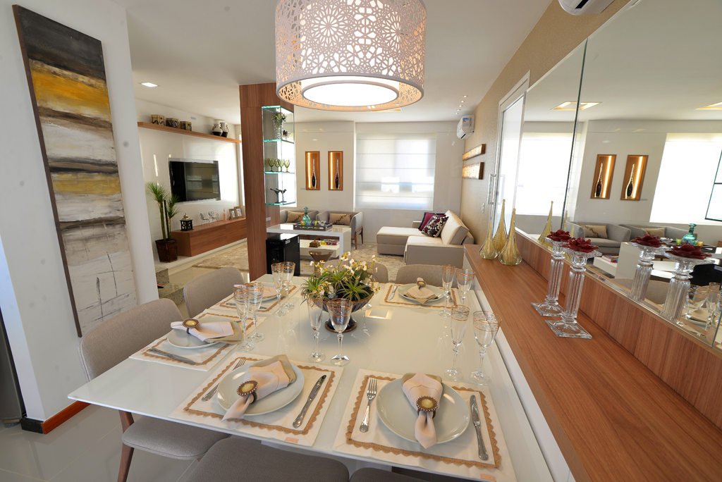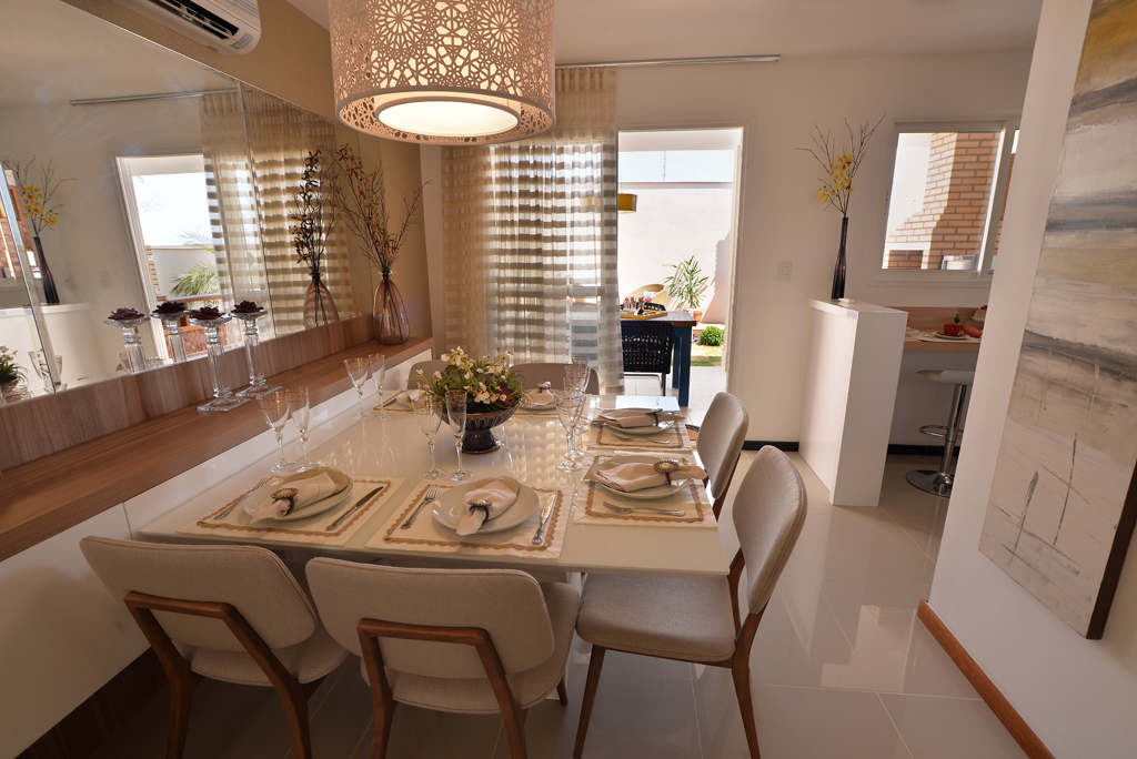 O ambiente destinado para jantar tem a grande mesa retangular como foco das atenções, mas o lustre elegante complementa o visual. O balcão de madeira ganha seu complemento no espelho em frente à mesa, o que traz profundidade ao cômodo.