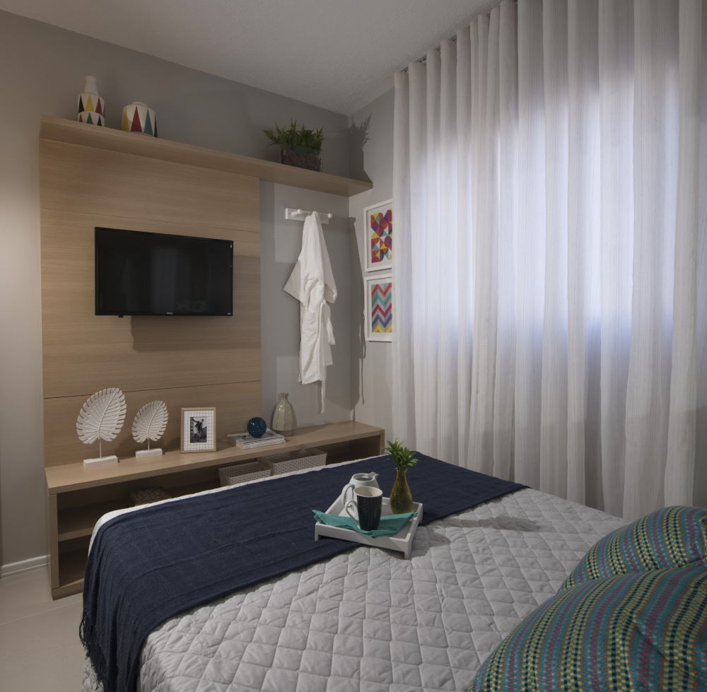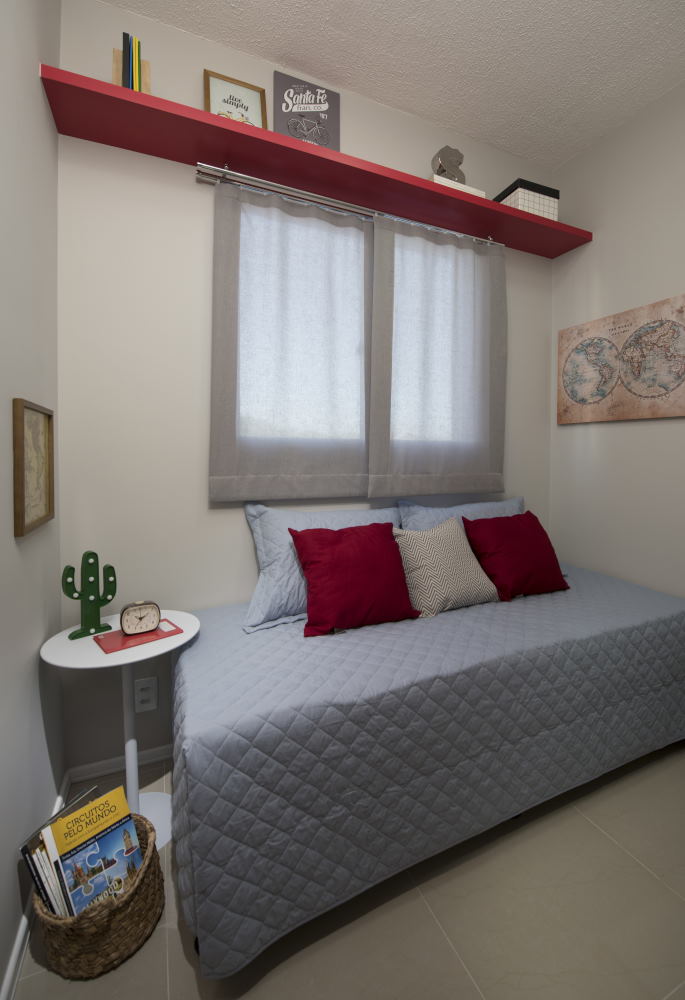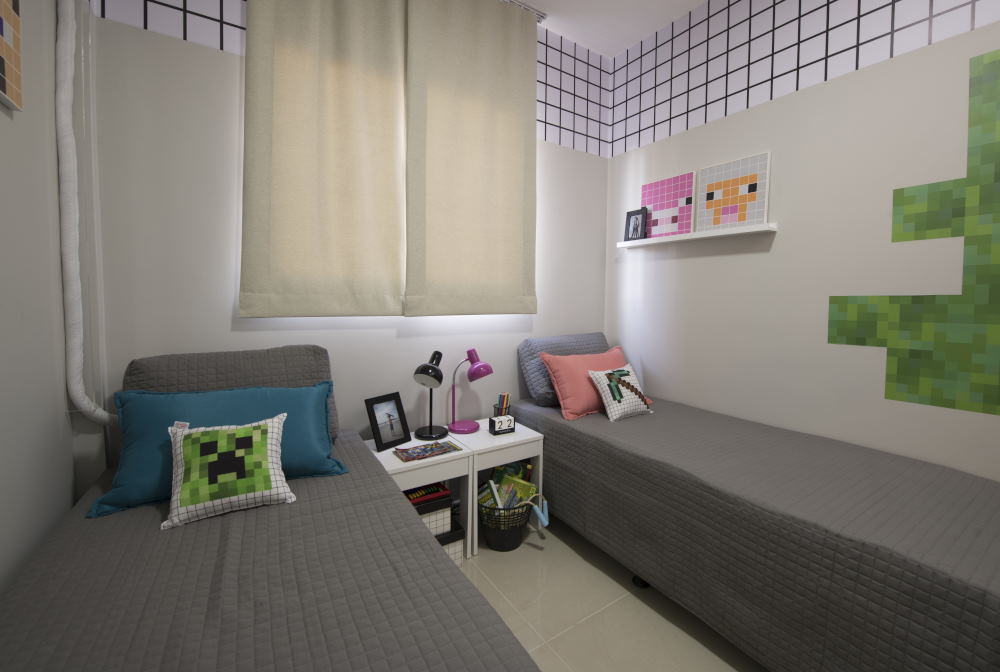 O foco da decoração é conforto em um espaço onde tudo é funcional e se encaixa perfeitamente, acomodando todos os cinco moradores. O quarto do casal manteve o tema neutro, com as paredes na cor cinza. Já o quarto dos filhos recebeu o tema Minecraft, agradando tanto meninos, quanto meninas. A diferença está clara na roupa de cama. No espaço múltiplo uso, a decoração foi para um quarto neutro, sem distinguir gênero ou idade.